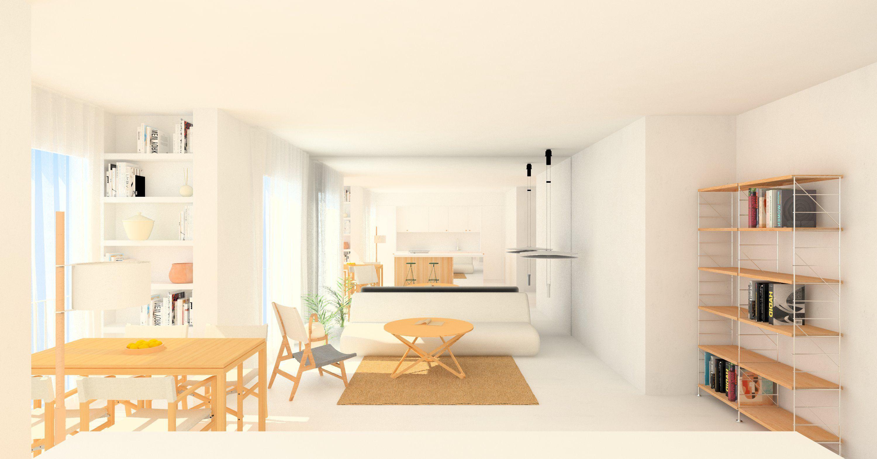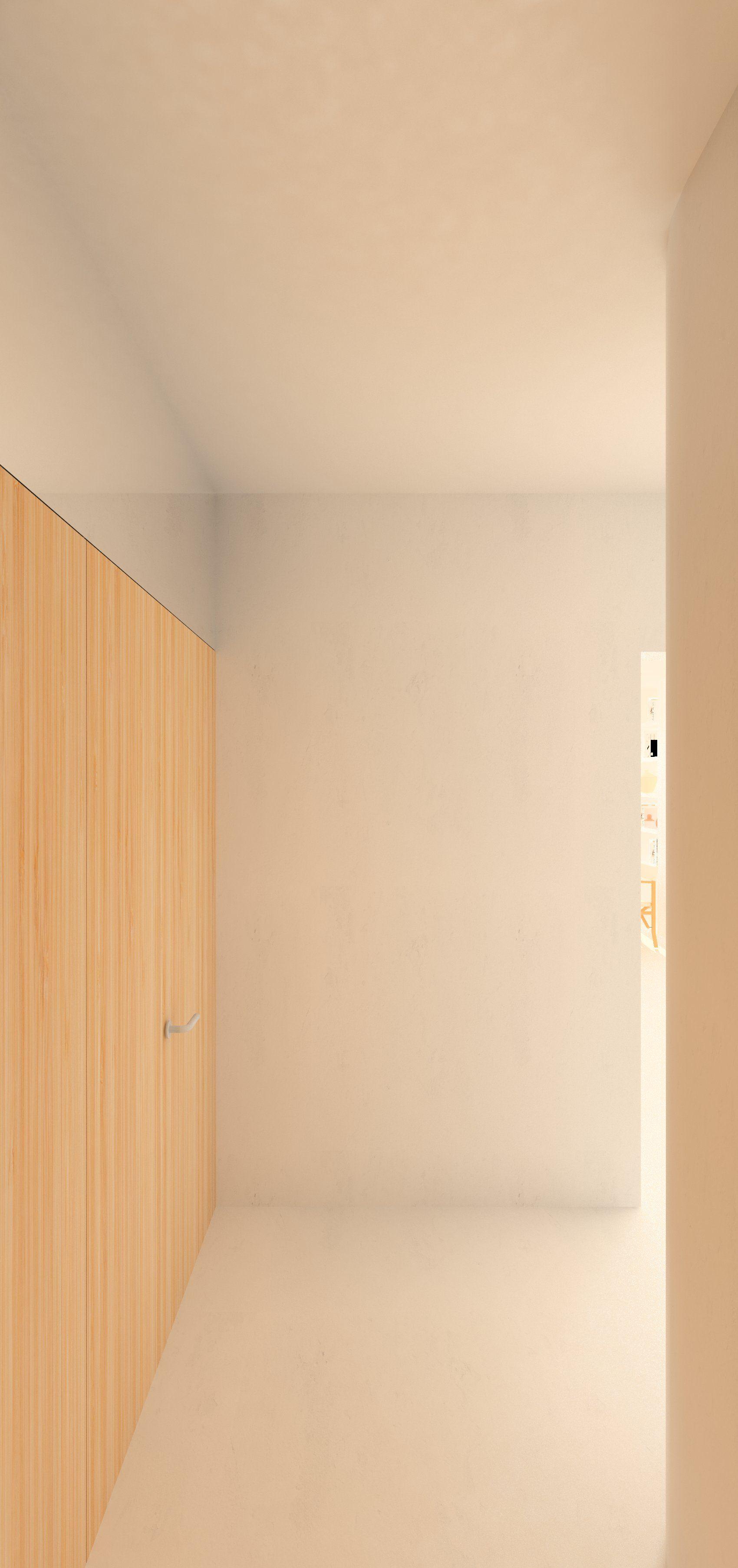 En base a aquesta condició, la decisió principal del projecte consisteix en ubicar els dormitoris i el bany a la crugia interior, convertint la crugia de la façana en un sol espai destinat a les activitats de dia: estar, menjar, treballar, estudiar i cuinar.