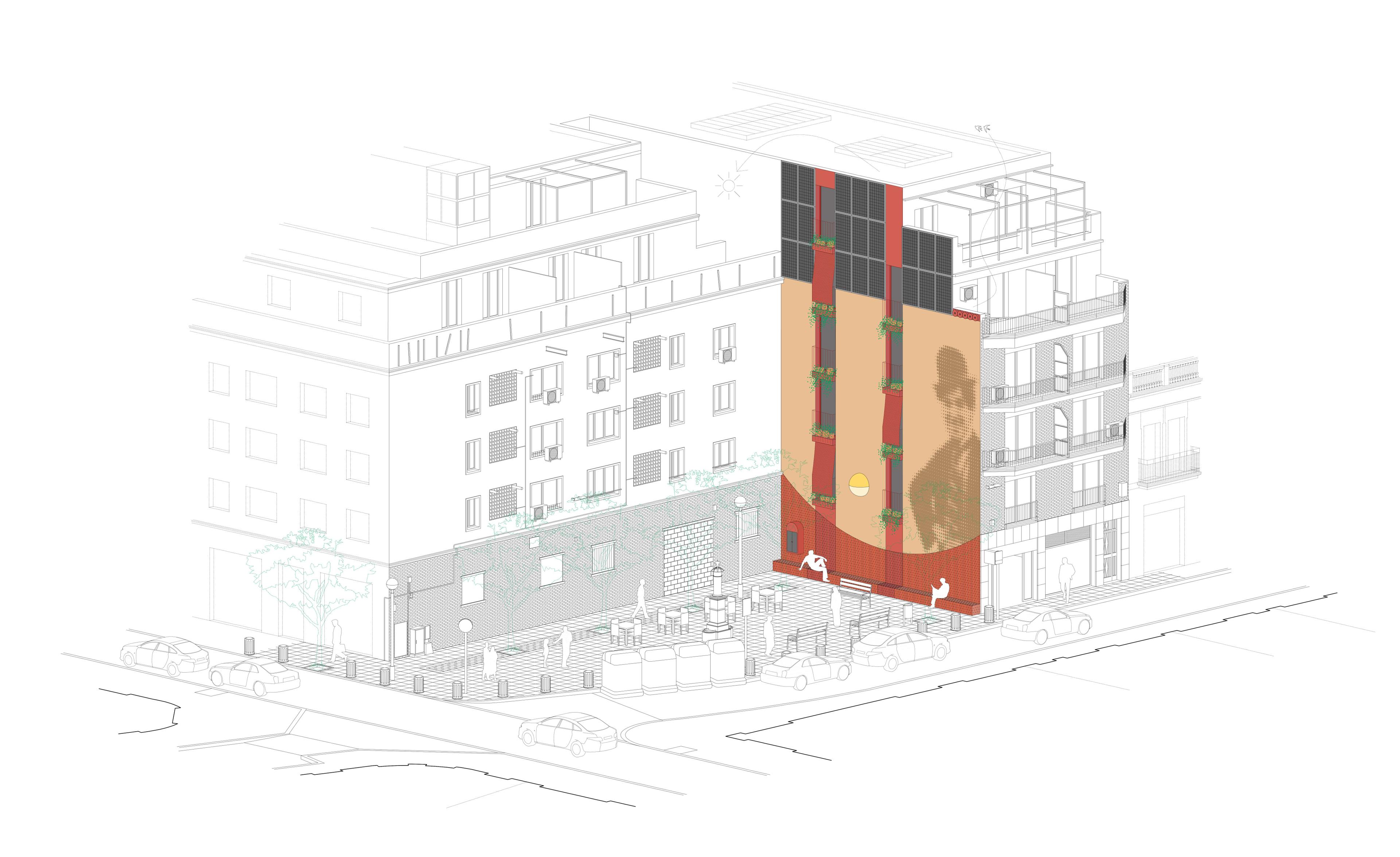 En primer lloc, millora la qualitat ambiental obrint nous balcons que donen urbanitat a la plaça i milloren l’habitabilitat de l’edifici, a més de resoldre les discontinuïtats de les cornises i els revestiments de les dues façanes adjacents a la intervenció.